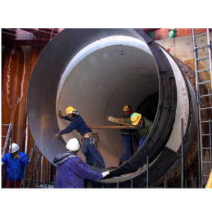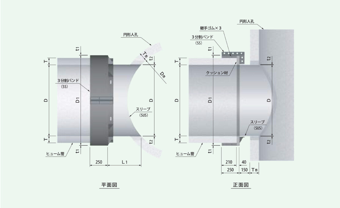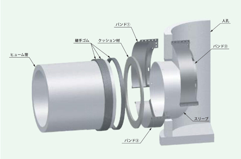 鋼製バンドは3分割されており、現場搬入、組み立てにおいて取り扱いが容易であるため、作業スペースを取らずに確実な施工ができます。特に人孔の形の違うもの(円形・矩形等)や、人孔取付部の偏心、角度付きのものにも容易に対応できるのが大きな特長です。