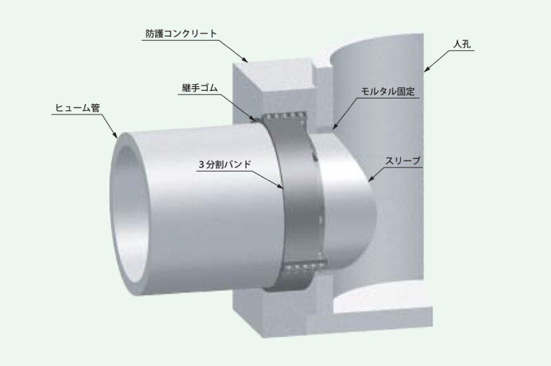 管の継手部は、特殊な形状を持つゴムリングとクッション材の使用により、地震動による地盤の変位(水平変位・曲げ変位)に追随する優れた性能があるので、耐震基準レベルIIに適合します。また、管の鋼製バンド部分まで保護コンクリートを施すので、継手は人孔との一体化に優れ、地震時の人孔取付部の安全性が十分に確保できます。