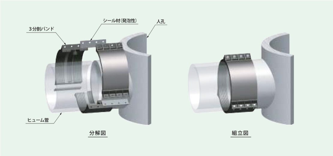鋼製バンドは継手ゴム・クッションゴムと一体化した構造で3分割されており、現場搬入、組立において取扱いが容易で、特殊機材も不要、作業スペースが少なく、工期短縮でトータルコスト削減が図られております。接続するヒューム管は異種管・異径管にも対応でき、偏芯取付も可能です。また、新設工事、既設管路の耐震化改良工事等どのようような現場状況においても施工ができます。