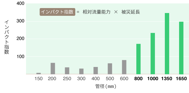 流量換算による被害インパクト指数で換算すると、口径の大きな管が被災すると小口径よりはるかに大きなインパクトになります。