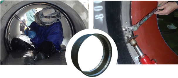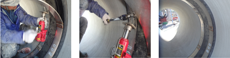 切削後、水密ゴムとSUSバンドで構成される内面バンドをジャッキで所定のトルクで拡張した後、ボルトで固定します。