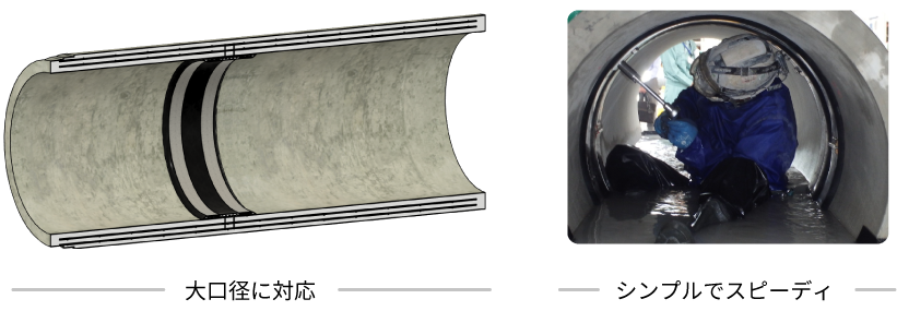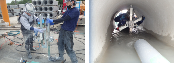 コンパクトな切削機械と取り付けが容易な内面バンドを組み合わせることにより、大口径にも対応可能でスピーディーかつ低コストを実現したSTUNP工法を開発しました。