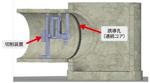 切削は連続コア式削孔機が管厚の20㎜残存させて管内面を360°回転して切削します。