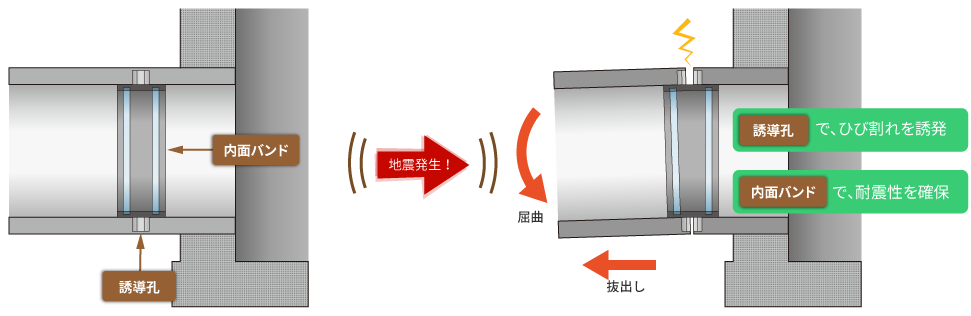地震が発生した際に、誘導孔によりひび割れを誘発させると同時に、管きょの抜け出しや屈曲に対し内面バンドが追従し、水密性を確保する構造です。