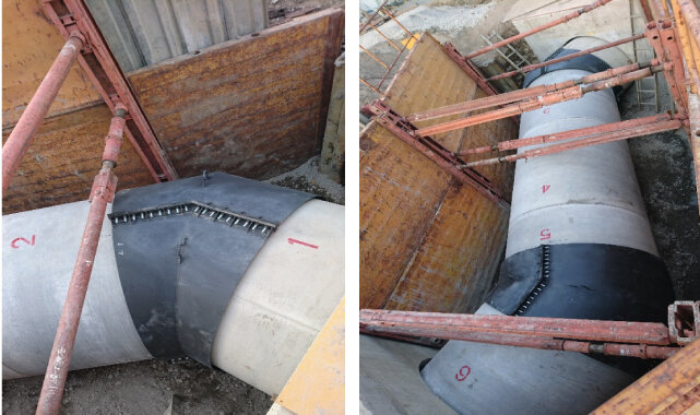 可とう性(折り曲げることが可能な性質)のある接続継手(耐震可とう継手)を用いて、管と管どうしの耐震性を高めます。既設管路の切り回しや、災害による管路の破断、新設の道路敷設などにより、既設の管と新設の管、もしくは新設の管どうしに用います。